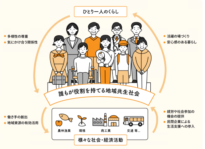 あわせて、地域で起こる自分や自分の大切な人が住み慣れた地域でいきいきと健やかに暮らすために、地域で暮らす誰もが役割を持ち、お互いを認め合い、時に支え合う体制を整えることも求められています。