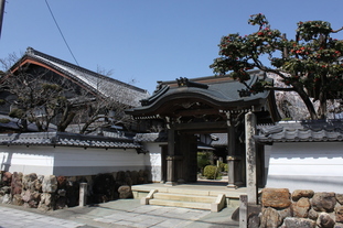 付近は寺が多く集まる寺内町(じないちょう)の一角。圓明寺の本堂、僧寮、庫裏、山門、鐘楼は国登録有形文化財にも指定されています。庫裏の屋根はむくり屋根という緩やかな丸いカーブを描くめずらしい意匠。山門脇のツバキも鮮やかな花を咲かせていました。