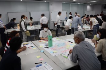 まず初めに「犬山市総合計画とは何か?」の簡単な説明があり、次に緊張をほぐすなどのため「ときほぐし(アイスブレイク)」をしながら班分けをし、タウンミーティングの本番である「ちいさな語り場(グループワーク)」を実施。「10年後、なったらいいね!こんなまち」を参加者各々が付箋に書き留め、地区全体が印刷されたワークシートに貼り付けながらグループの中で意見を共有しました。その後、グループの発表者が話題に上がった意見から、主なものを全体に向けて発表し、参加者全員でグループワークの成果を共有し、第1部「犬山市のまちづくりを考えよう」を終えました。