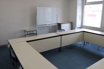12人収容のカーペット敷の会議室です。小グループでの会議に最適です。